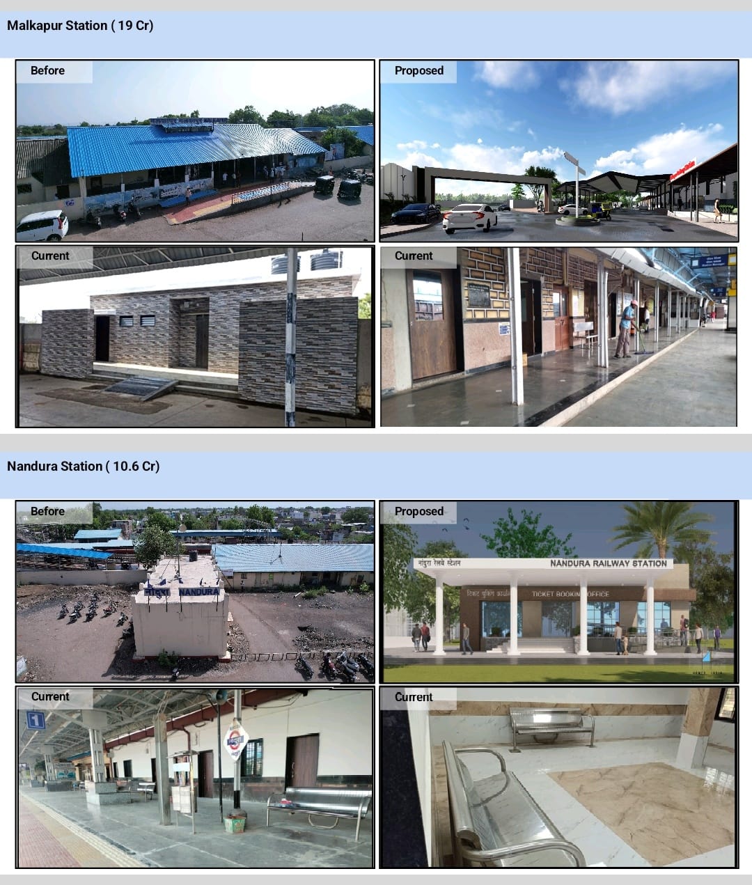 या पुनर्विकासात स्थानकांची नावे आणि त्यासाठीचा निधी पुढीलप्रमाणे आहे. अजनी स्टेशन (297.8 कोटी), नागपूर जं. (589 कोटी), नेताजी सुभाषचंद्र बोस इतवारी जं. (17.4 कोटी), जालना (189 कोटी), छत्रपती संभाजीनगर (241 कोटी), रोटेगाव (12 कोटी), अहिल्यानगर (31 कोटी), भायखळा (35.5 कोटी), चिंचपोकळी (52 कोटी), चर्नी रोड (23 कोटी), छत्रपती शिवाजी महाराज टमिनल (1813 कोटी), ग्रॅट रोड (27 कोटी), लोअर परेल (30 कोटी), मरिन लाईन्स (27.7 कोटी), सॅण्डहर्स्ट रोड (16.4 कोटी), मुर्तिजापूर स्टेशन (13 कोटी), बडनेरा (36.3 कोटी), बारामती (11.4 कोटी), दौंड (44 कोटी), केडगाव (12.5 कोटी), परळी वैजनाथ (25.7 कोटी), भंडारा रोड (7.7 कोटी), गोंदिया 40 कोटी), तुमसर रोड (11 कोटी), टिटवाळा (25 कोटी), शेगाव (29 कोटी), बल्लारशाह (31.4 कोटी), चंद्रपूर (25.5 कोटी), चांदा फोर्ट (19.3 कोटी), धुळे (9.5 कोटी), लासलगाव (10.5 कोटी), मनमाड (45 कोटी), नगरसोल (20.3 कोटी), नांदगाव (20 कोटी), आमगाव (7.8 कोटी), वडसा (20.5 कोटी), हातकंणगले (6 कोटी), हिमायतनगर (43 कोटी), हिंगोली डेक्कन (21.5 कोटी), किनवट (23 कोटी), चाळीसगाव (35 कोटी), अंमळनेर (29 कोटी), धरणगाव (26 कोटी), पाचोरा जं. (28 कोटी), दिवा (45 कोटी), मुंब्रा (15 कोटी), शहाड (8.4 कोटी), कोल्हापूर – छत्रपती शाहू महाराज टर्मिनस (43 कोटी), लातूर (19 कोटी), जेऊर (20 कोटी), कुर्डूवाडी जं (20 कोटी), फलटण (1 कोटी), वाठर (8 कोटी), आकुर्डी (34 कोटी), चिंचवड (20.4 कोटी), देहू रोड स्टेशन (8.05 कोटी), तळेगाव स्टेशन (40.34 कोटी), मालाड स्टेशन (12.32 कोटी), कुर्ला जं. स्टेशन (28.81 कोटी), कांजुरमार्ग स्टेशन (27 कोटी), विद्याविहार स्टेशन (32.8 कोटी), विक्रोळी स्टेशन (19 कोटी), जोगेश्वरी स्टेशन (119 कोटी), माटुंगा स्टेशन (17.3 कोटी), परळ स्टेशन (19.4 कोटी), प्रभादेवी (21 कोटी), वडाळा स्टेशन (23 कोटी), भोकर स्टेशन (11.3 कोटी), धर्माबाद स्टेशन (30 कोटी), मुखेड जं.स्टेशन (23 कोटी), उमरी स्टेशन (8 कोटी), देवळाली स्टेशन (10.5 कोटी), इगतपुरी स्टेशन (12.5 कोटी), धाराशिव स्टेशन (22 कोटी), गंगाखेड स्टेशन (16 कोटी), मनवथ रोड स्टेशन (12 कोटी), परभणी जं. स्टेशन (26 कोटी), परतूर स्टेशन (23 कोटी), पूर्णा जं. स्टेशन (24 कोटी), सेलू स्टेशन (23.2 कोटी), हडपसर स्टेशन (25 कोटी), गोधनी स्टेशन (29 कोटी), काटोल स्टेशन (23.3 कोटी), कामठी स्टेशन (7.7 कोटी), नरखेड जं. स्टेशन (37.6 कोटी), कराड स्टेशन (12.5 कोटी), सांगली स्टेशन (24.2 कोटी), लोणंद जं.स्टेशन (10.5 कोटी), सातारा स्टेशन (34.3 कोटी), बेलापूर स्टेशन (32 कोटी), कोपरगाव स्टेशन (30 कोटी), सेवाग्राम स्टेशन (18 कोटी), धामणगाव स्टेशन (18 कोटी), हिंगणघाट स्टेशन (22 कोटी), पुलगाव स्टेशन (16.5 कोटी), उरूली स्टेशन (13 कोटी), वाशिम स्टेशन (20.3 कोटी), मलकापूर स्टेशन (19 कोटी), नांदुरा स्टेशन (10.6 कोटी), रावेर स्टेशन (9.2 कोटी), सावदा स्टेशन (8.5 कोटी), दुधनी स्टेशन (22 कोटी), पंढरपूर स्टेशन (40 कोटी), सोलापूर स्टेशन (56 कोटी), नंदूरबार स्टेशन (15 कोटी) आणि पालघर स्टेशन (17.5 कोटी).