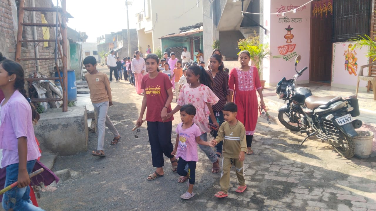 गावातून नवागत विद्यार्थ्यांसह काढण्यात आली प्रभातफेरी, ज्यात पालक, शाळा व्यवस्थापन समितीचे सदस्य, शिक्षक यांचा उत्स्फूर्त सहभाग होता.