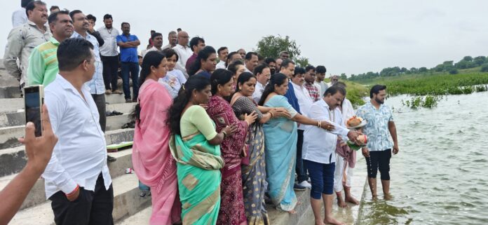 पूजनानंतर आमदार श्री.गायकवाड यांच्या हस्ते नारळ अर्पण करण्यात आला, तर माजी नगराध्यक्षा सौ. पुजाताई गायकवाड यांनी पारंपरिक साडीचोळी अर्पण करून जलपूजन विधी पार पाडला.
