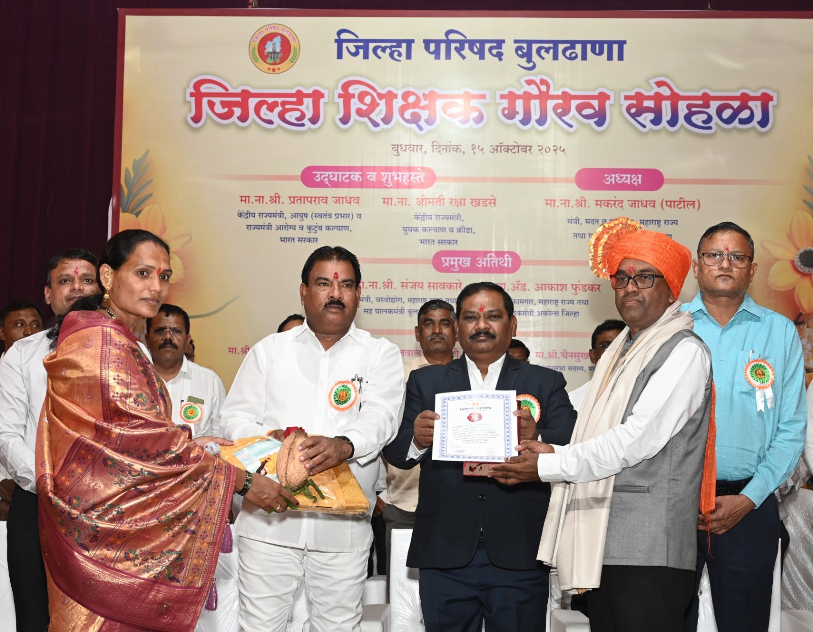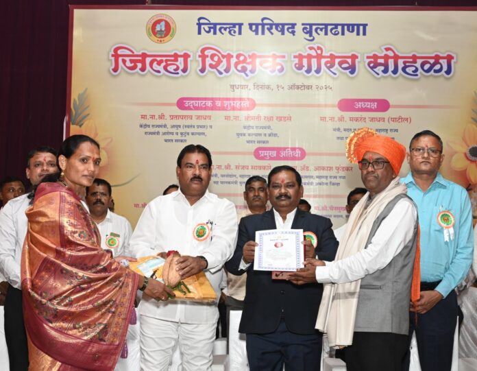 या समारंभात सन 2018-19 ते 2024-25 या सहा वर्षांतील 70 शिक्षकांचा सपत्नीक शाल, श्रीफळ, साडी, स्मृतिचिन्ह, प्रमाणपत्र व पुष्पगुच्छ देऊन सन्मान करण्यात आला. या सोहळ्यात “मिशन झेड” उपक्रमात योगदान देणाऱ्या शिकवणी संस्था संचालक आणि जनजागृतीसाठी कार्य करणाऱ्या कलावंतांचा सत्कार करण्यात आला. तसेच “निपुण महाराष्ट्र” उपक्रमात संपूर्ण राज्यात बुलढाणा जिल्ह्याने तृतीय क्रमांक मिळवल्याबद्दल डॉ. जगराम भटकर, शिक्षणाधिकारी विकास पाटील, अनिल आकाळ आणि डॉ. वैशाली ठग यांचा मुख्य कार्यकारी अधिकारी गुलाब खरात यांच्या हस्ते विशेष सत्कार करण्यात आला.