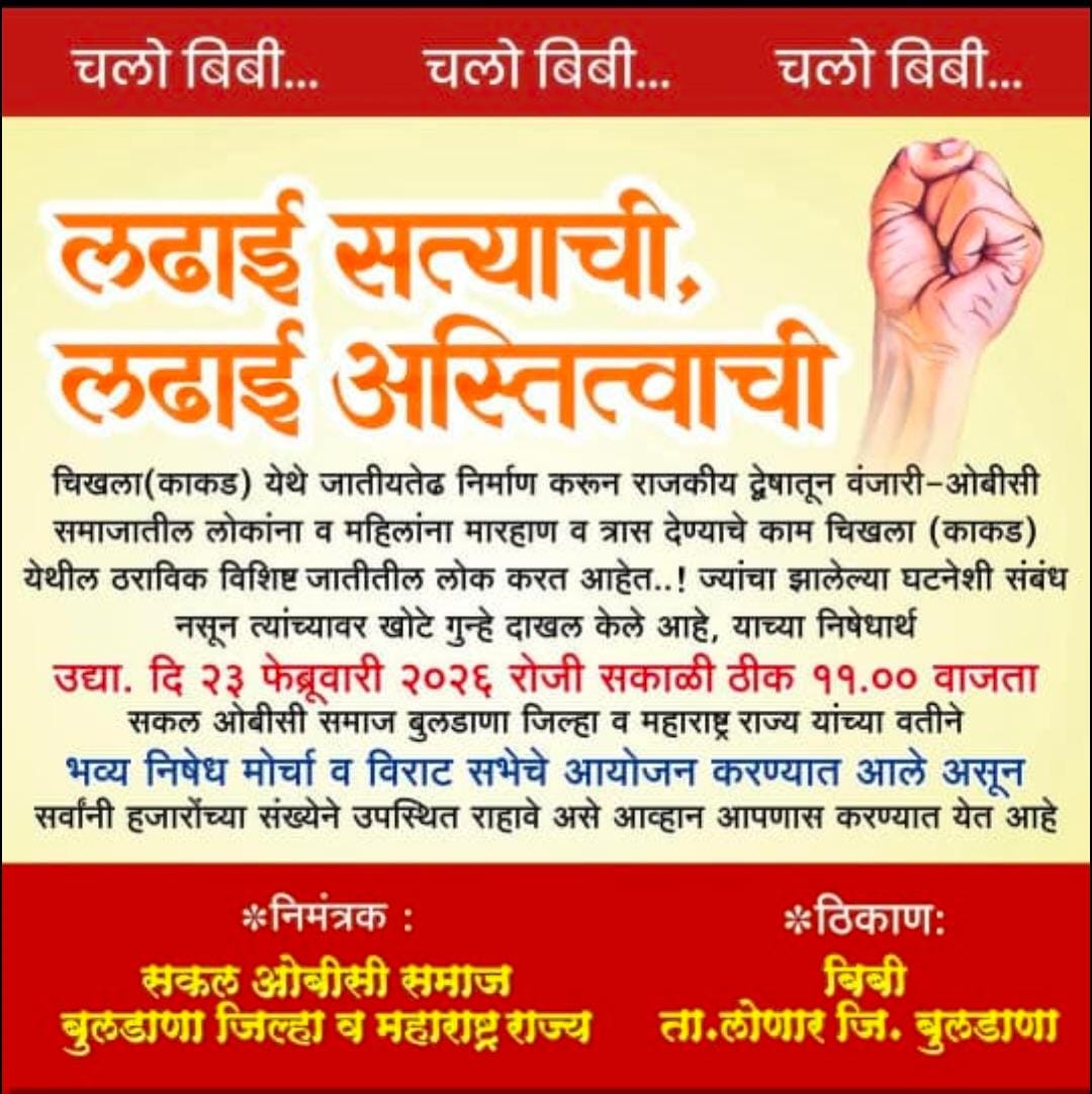 याच्या निषेधार्थ सकल ओबीसी समाज, बुलढाणा जिल्हा व महाराष्ट्र राज्य यांच्या वतीने उद्या दिनांक २३ फेब्रुवारी रोजी सकाळी ११ वाजता भव्य निषेध मोर्चा व विराट सभेचे आयोजन करण्यात आले आहे. ही सभा चिखला काकड (ता. लोणार, जि. बुलढाणा) येथे होणार असून मोठ्या संख्येने उपस्थित राहण्याचे आवाहन करण्यात आले आहे.